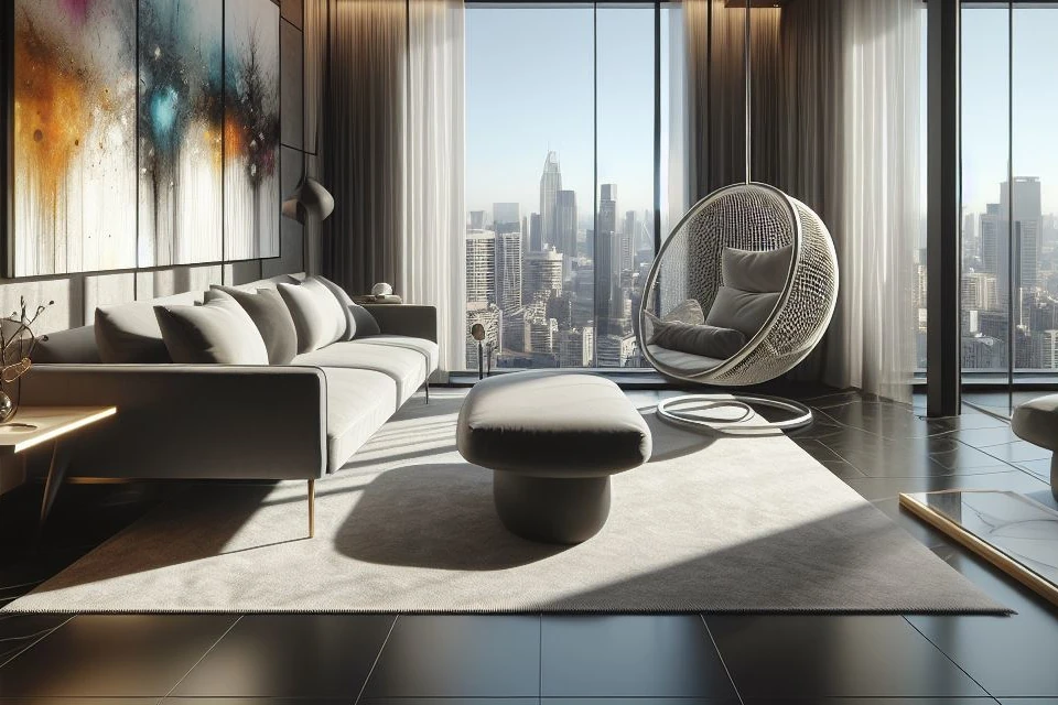 La luce naturale inonda la stanza attraverso le ampie finestre, offrendo una vista mozzafiato sulla campagna circostante. La bellezza dell'ambiente esterno viene portata anche all'interno grazie a opere d'arte curate con attenzione e alle delicate tonalità della terra che riflettono la serenità del paesaggio.